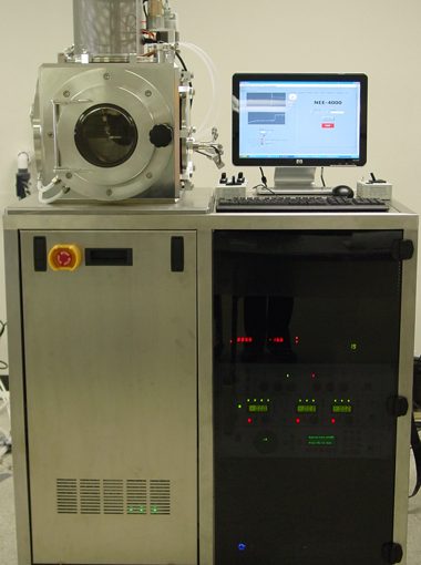 Nano-Master, Inc. NEE-4000 Electron Beam Evaporation Systems(E Beam) come in a dual chamber configuration consisting of the main chamber where platen is located and a secondary chamber for housing the e-beam source. This configuration with a gate valve between two chambers may be used as a load lock to keep the electron-beam (e-beam) source pockets in vacuum while substrate is loaded and unloaded from the main chamber substrate holder or platen. On other applications where automatic loading and unloading of wafers is needed, it can be achieved through a third load lock chamber that may be attached to the left face of the cube. Co-evaporation capability with multiple e-beam sources and ability to program compositions or compositional gradients through PC control can be provided.Nanomaster’s E-Beam Evaporation System offers unique features like;